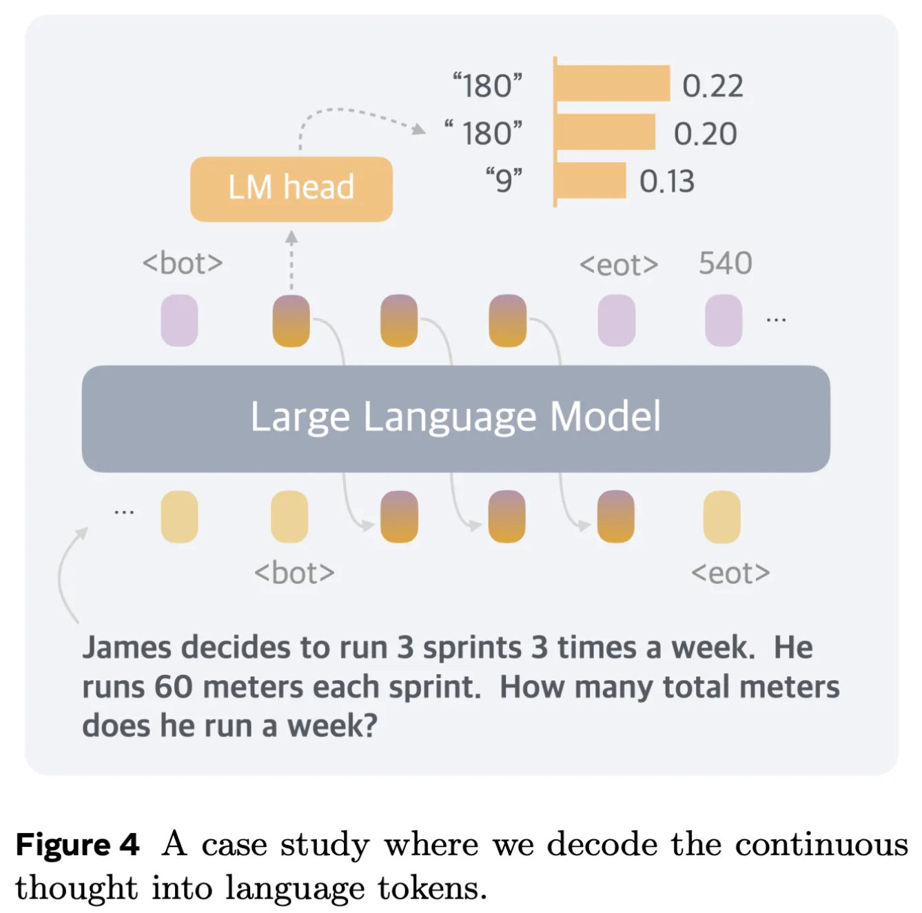 - continuous thoughts의 원래 목적은 잠재 공간에서 생성되어 reasoning에 사용되는 것이지만, Language Token으로 해석하는 데 사용할 수 있다. 즉, reasoning step을 추적할 수 있다.