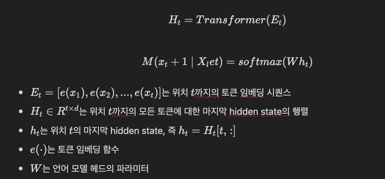 - 입력 시퀀스 x=(x_1,...,x_T)에 대해, 표준 대규모 언어 모델 M은 다음과 같이 설명될 수 있다.
