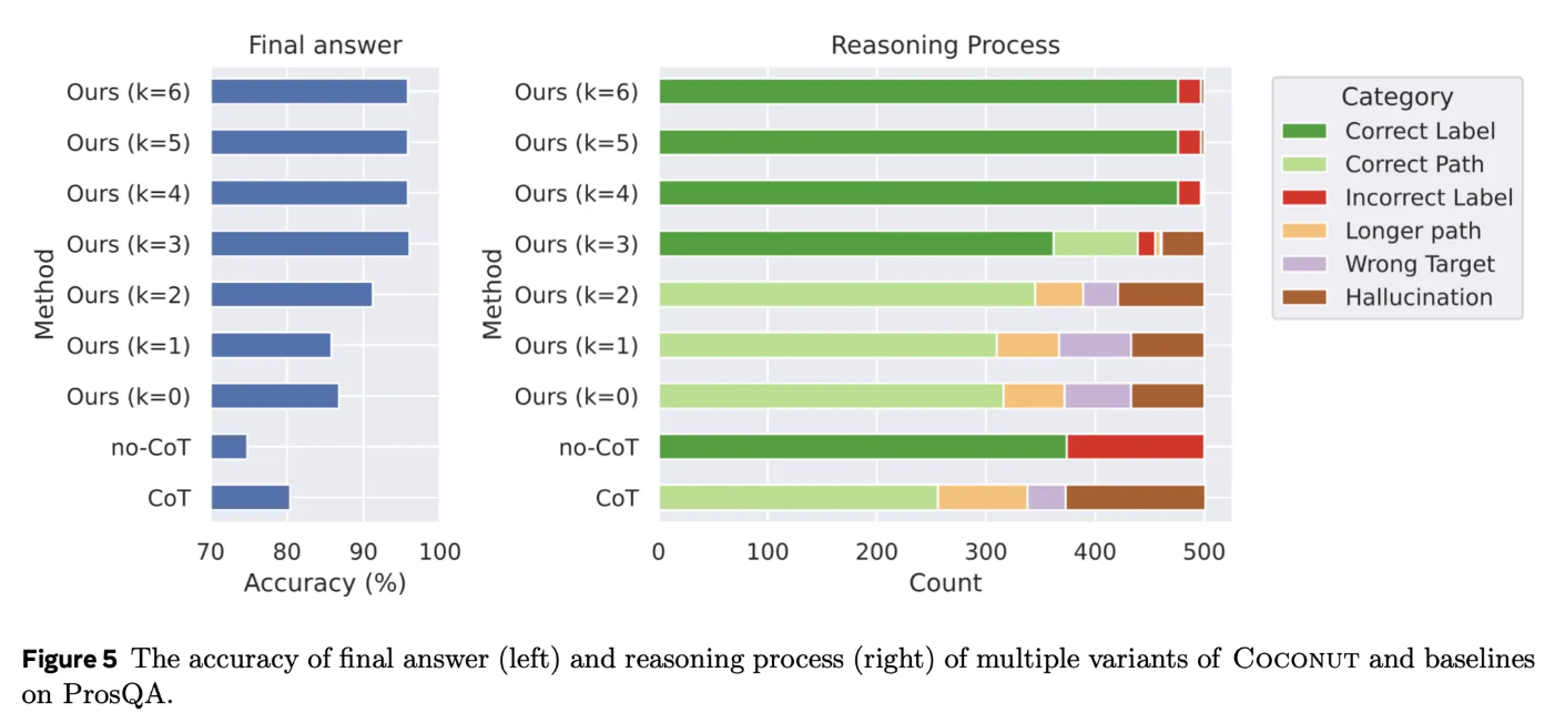 - no-CoT나 k가 충분히 큰 COCONUT에서는 reasoning을 출력하지 않기 때문에 정답/오답만이 존재.