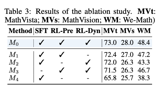 - M0 (SFT + RL-Pre + RL-Dyn): 성능 최고 (MathVista 73.0, MathVision 28.0, We-Math 48.4)