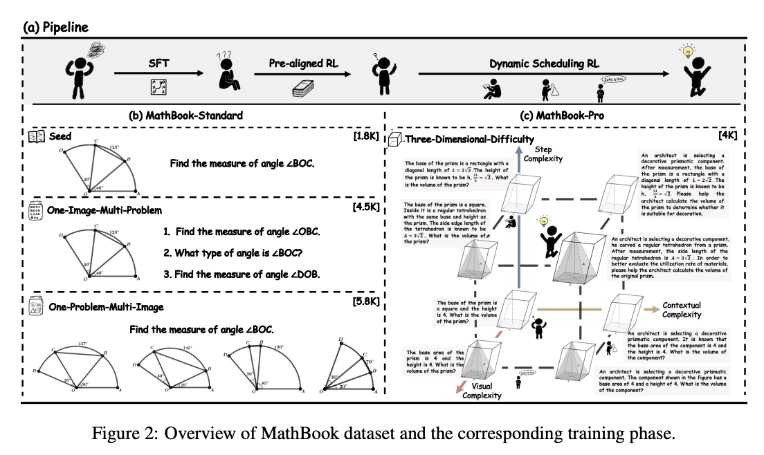 둘째, 데이터셋을 두 가지로 나눴는데, MathBook-Standard는 폭넓은 개념을 다루며 확장성이 높고, MathBook-Pro는 문제를 난이도 3차원 공간 속에서 변형하여 같은 문제를 7단계 버전으로 만들어 점진적인 학습이 가능하도록 했습니다.