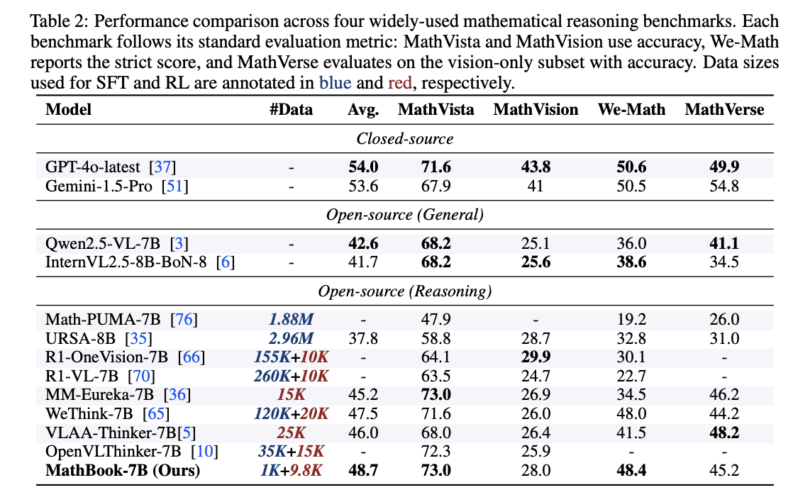 - 주목할 점: MathBook-7B는 훈련 샘플이 9.8K(약 1만 개 미만) 밖에 안 되는데도 강력한 성능을 발휘.