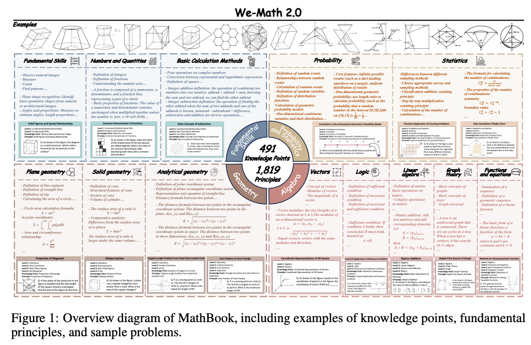 WE-MATH 2.0은 멀티모달 대형 언어 모델(MLLMs)의 시각적 수학 추론 능력을 키우기 위해 설계된 통합 시스템입니다. 이 시스템은 세 가지 핵심 요소로 구성됩니다.